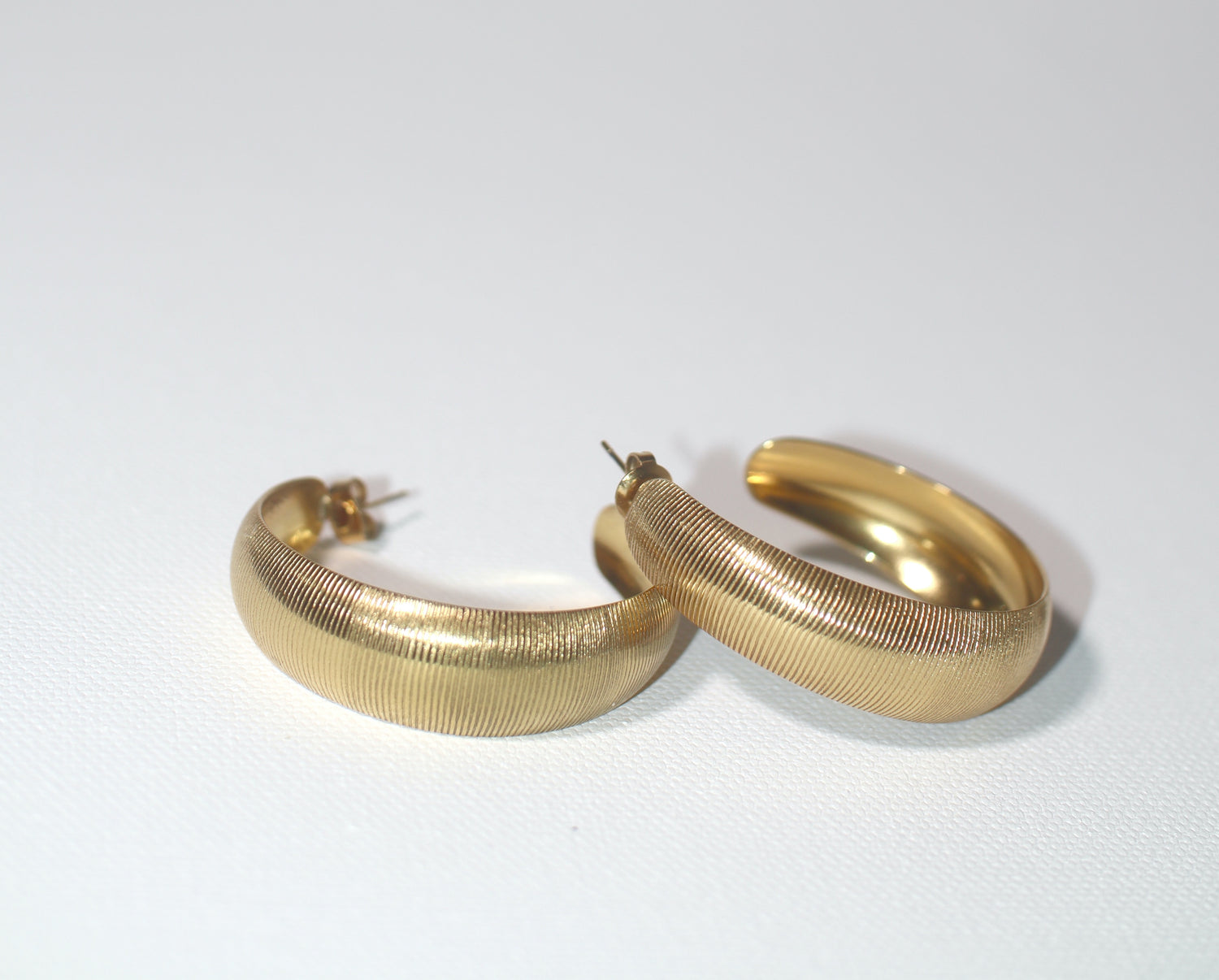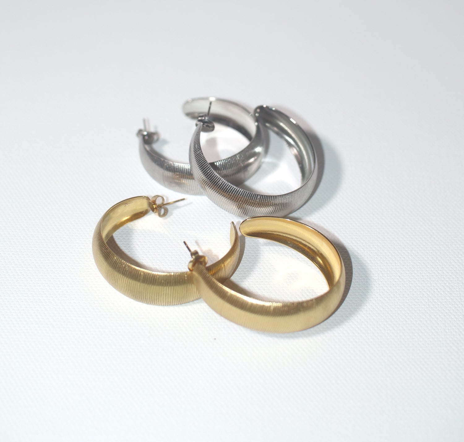 Elevate your style with the Kyla Hoop, featuring a sophisticated ribbed design crafted from durable stainless steel and finished with a luxurious 18k gold plating.