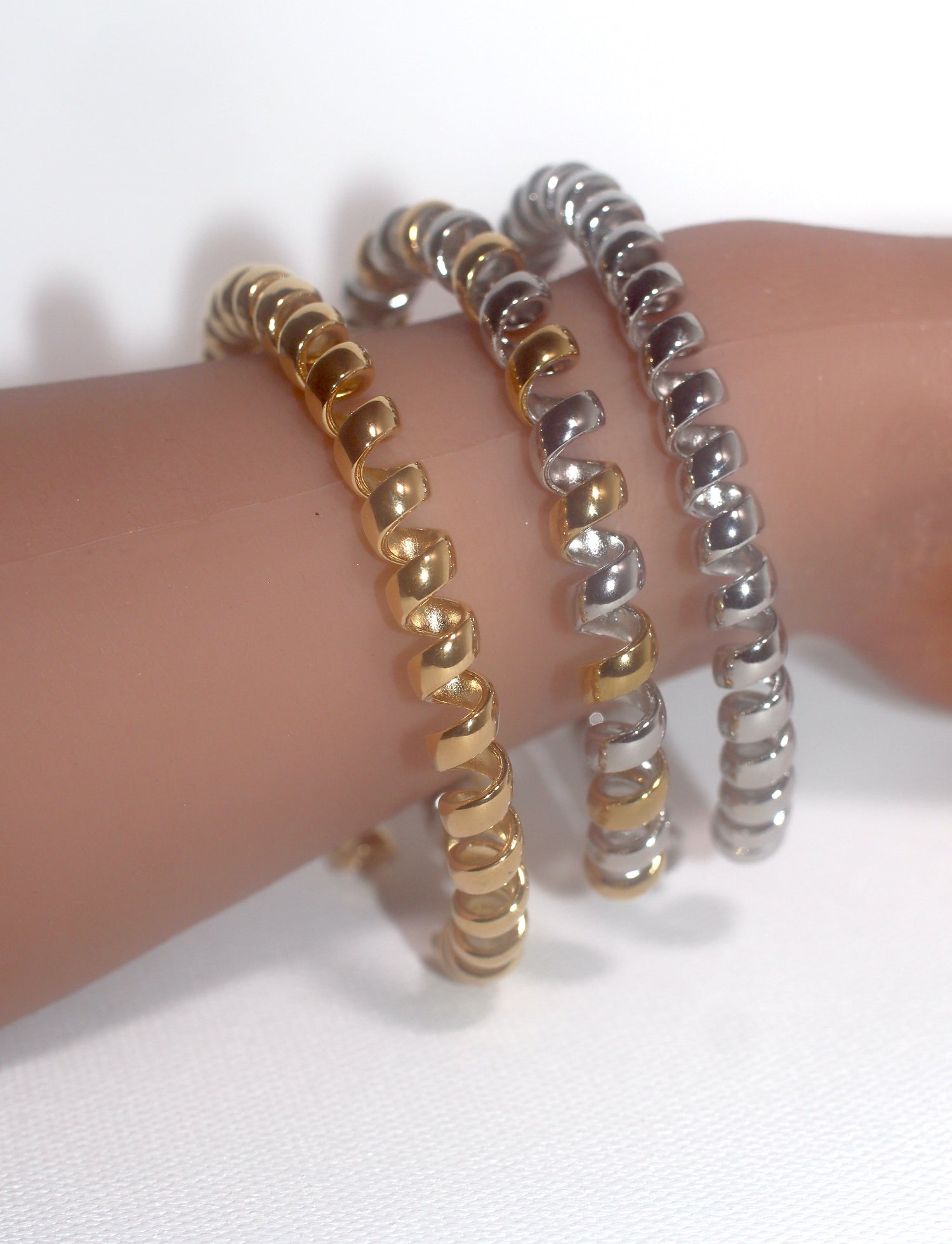 Elevate your wrist game with the Twist Cuff! This playful spiral bracelet adjusts to fit any wrist and gleams with 18k gold plating over durable stainless steel. A fun, versatile piece that works solo or stacked.